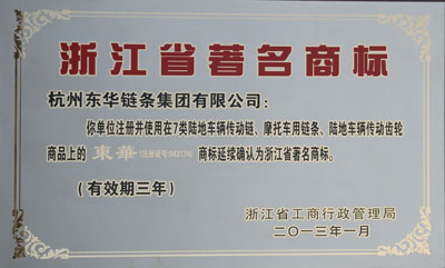 東華加強(qiáng)自主品牌建設(shè),創(chuàng)建的各類商標(biāo)也得到各級政府部門、主管部門的高度評價。“東華”商標(biāo)被國家工商行政管理總局商評委認(rèn)定為“馳名商標(biāo)”、東華“DONGHUA”牌工業(yè)鏈條為杭州市名牌產(chǎn)品、中國機(jī)電產(chǎn)品進(jìn)出口商會“推薦出口品牌”、“自強(qiáng)(Zq)”牌工業(yè)鏈條為浙江名牌產(chǎn)品、東華注冊并使用在7類鏈條商品上的“自強(qiáng)”(注冊證號:1542721商標(biāo)為浙江省著名商標(biāo)、東華“DH”為“浙江出口名牌”和“中國機(jī)械工業(yè)優(yōu)質(zhì)品牌”、“東華”企業(yè)商號為“浙江省知名商號”、東華集團(tuán)為“出口免驗企業(yè)”、“中國質(zhì)量誠信企業(yè)”等榮譽(yù)稱號。