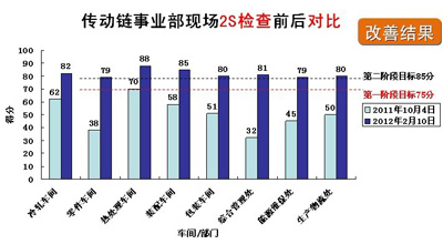 2S管理明顯提高并標準化作業(yè) 通過2S的運行,傳動鏈事業(yè)部員工的現(xiàn)場2S意識和管理都得到了明顯提升,如包裝車間現(xiàn)場管理的雜亂改善到目前的現(xiàn)場流程規(guī)范、通道流暢、物品擺放整齊等,熱處理車間設備運行狀態(tài)可視化等;同時廣大員工學會了總結與標準化操作,如現(xiàn)場檢查標準化、任務改善驗證標準化、管理點檢標準化、現(xiàn)場作業(yè)標準化等。