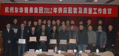 會議由副總經理張寶康主持,張副總就2011年主要經濟指標完成情況和2012年經濟目標進行了簡要講話;總工程師葉斌就東華新品種開發取得的成果及發展目標、技術工作方面作了講話;副總經理袁立華就東華2011年完成的經濟指標,供貨質量情況及存在的差距、外協件的質量及體系管理方面進行了講話,并公布了2012年主要工作計劃;副總經理廖杭州就2011年輸送鏈事業部的生產經營情況進行了回顧,同時代表各事業部就2012年事業部對采購和供應商的主要要求即采購目標和供應鏈建設提出要求;財務總監趙鵬飛宣布2011年優秀供應商名單,公司高層向優秀供應商代表頒發證書并合影。