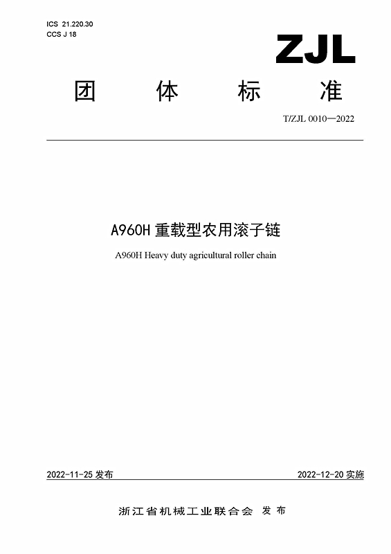 近日,浙江省機械工業聯合會批準、發布團體標準T/ZJL 0010—2022《A960H重載型農用滾子鏈》(以下簡稱《A960H鏈條》),自12月20日起實施。這項浙機聯團體標準由東華牽頭負責制定,東風農機集團等4家單位參加起草。《A960H鏈條》標準規定了適用于在各類農作物作業機械上使用的A960H重載型農用滾子鏈的主要參數和尺寸、技術要求、試驗方法、檢驗規則等要求。
